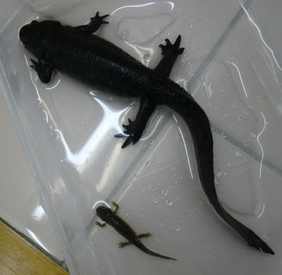 スケール でかいです イベリア半島の個体群のイベリアトゲイモリ しかもワイルドの飼い込み個体です 約27cmあります 隣は17cmのcbの個体です 大きさ 体格も別物みたいな迫力あります 1匹のみのメス個体です